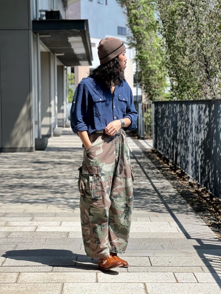 ブルーのシャツと迷彩パンツを合わせた大人のミリタリーコーデ。カジュアルなニット帽はもちろん相性バッチリですが、大人カジュアルに決めるならニット帽のクオリティにもこだわって。上質な素材感やシルエットのアイテムを選べば、コーディネートが上品に引き締まります。