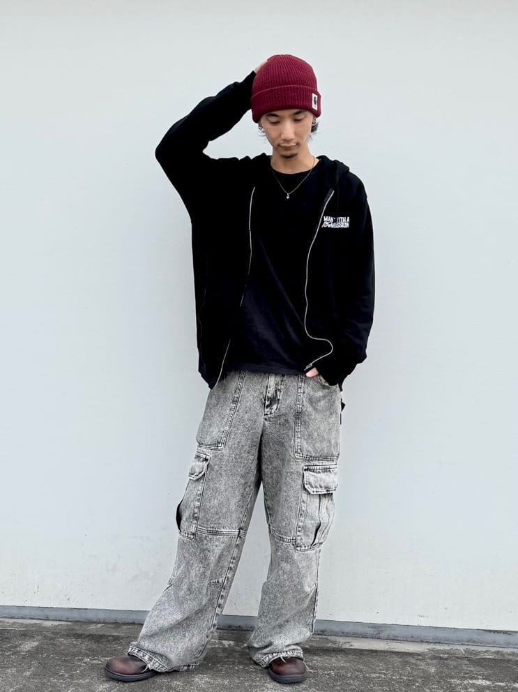 トレンドのケミカルウォッシュカーゴパンツを主役に、全身をブラックで引き締めたクールなスタイル。バーガンディのニット帽が、重たくなりがちなダークトーンのスタイリングに、温かみと遊び心をプラスしています。