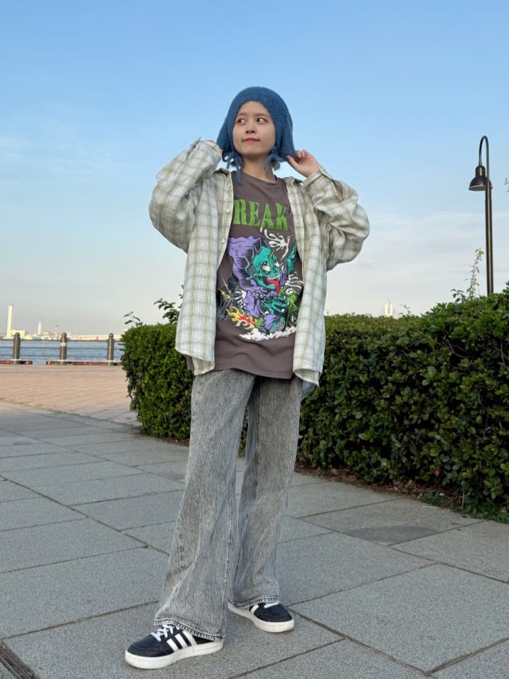 インパクト抜群のプリントに、あえてキュートな耳当て付きニット帽を合わせることで遊び心たっぷりに仕上げたストリートコーデ。プリントとニット帽をブルー系でリンクさせることで、ミスマッチにならずにまとまりのあるスタイリングに。