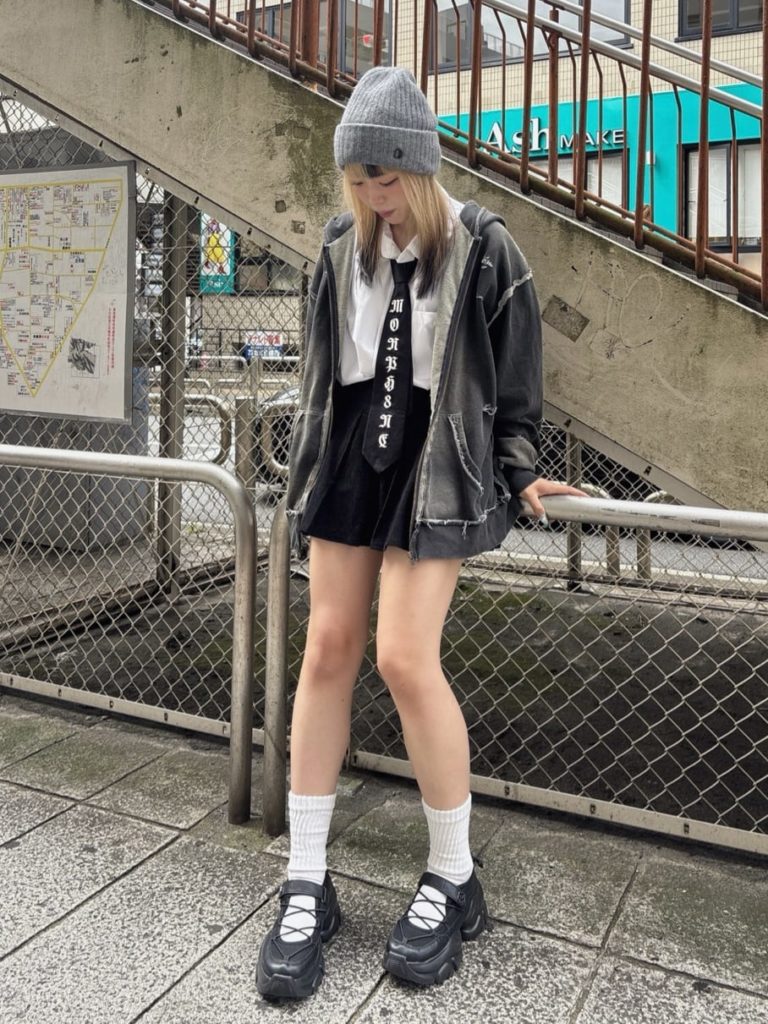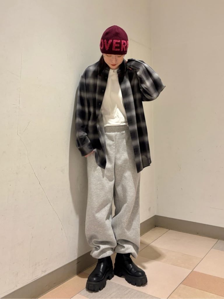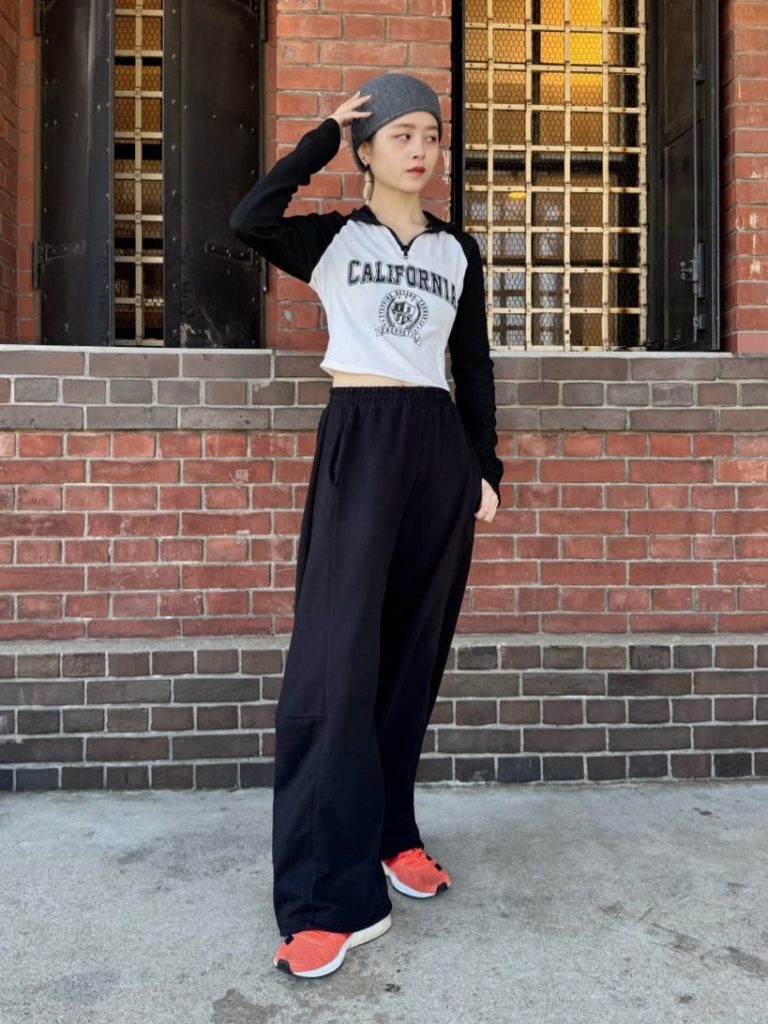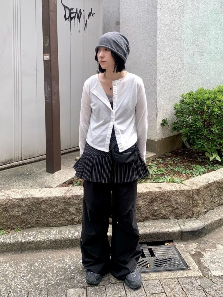 タイト×ルーズのシルエットがY2Kムードたっぷりなコーデ。グレーのニット帽が抜け感を与えつつ、コーデの邪魔をしない絶妙なバランス感です。モノトーンのウェアにマッチし、スポーティなスタイリングの完成度を上げています。