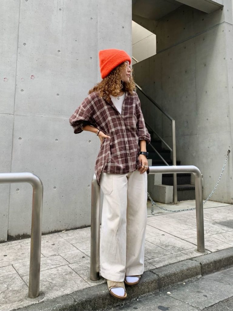 オレンジのニット帽はアクティブなイメージがありますが、ブラウン系のコーデに合わせると差し色として大人のコーディネートにもマッチ。オレンジとブラウンはともに黄色みのあるカラーなので、トーンが違っても合わせやすいですよ。