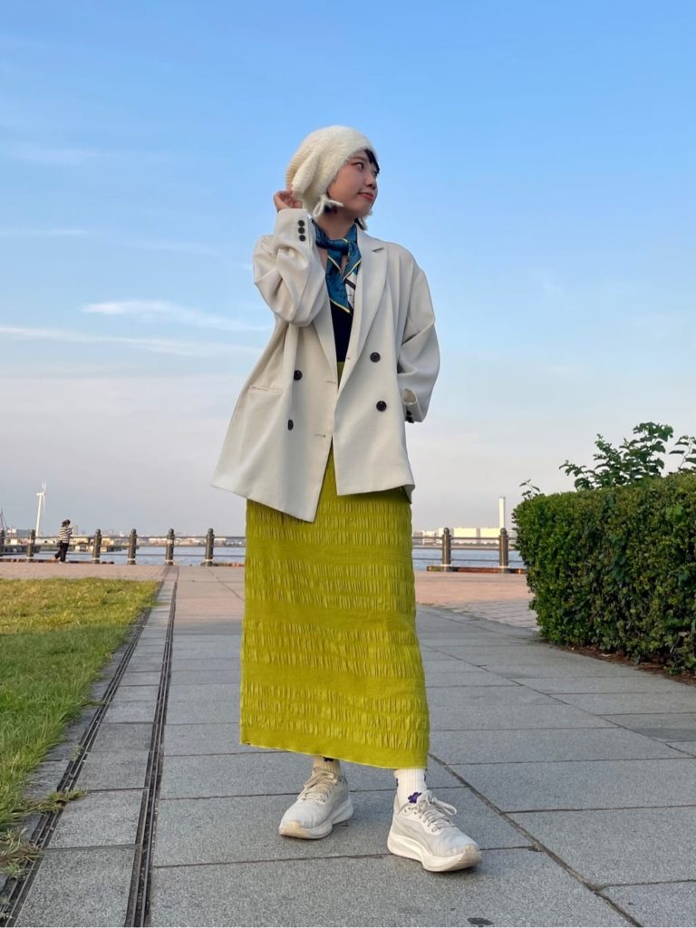 素材感と大胆な色使いで個性を出したスタイリング。きれいめコーデにスニーカーを合わせると足元だけ浮いてしまいがちですが、ふわふわのニット帽を合わせることで全体にリズムが生まれています。