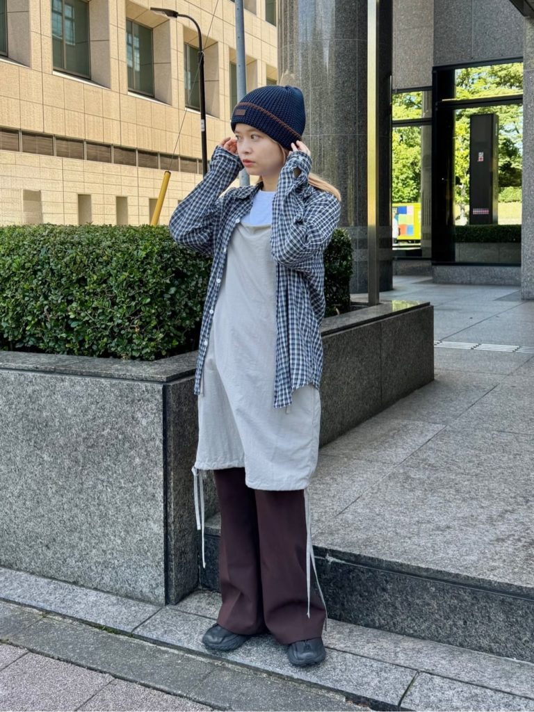 カジュアルコーデの間にキャミワンピを挟み、立体感を出したレイヤードコーデ。それだけでも十分おしゃれですが、コーデ全体を引き締めるのにニット帽が一役買っています。シャツとパンツ、それぞれとニット帽の色がリンクしているところが、さすがのテクニック。