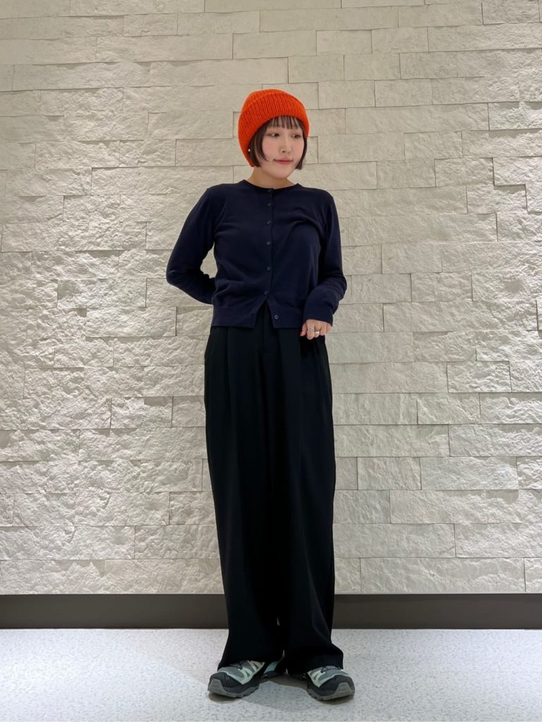 ダークトーンで統一した、大人のスタイリッシュなコーディネート。スニーカーのカジュアルなイメージに呼応するように、帽子もニット帽をチョイスして。あえて明るいオレンジを選ぶことで、遊び心と華やかさをプラス。顔まわりを明るく見せる効果も期待できます。