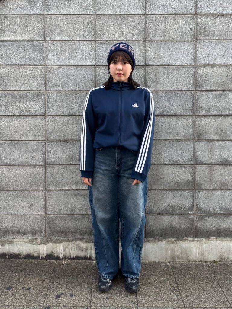 ジーンズにトラックジャケットを合わせた90’sの王道スタイル。リバイバルムードを加速させるのが、ロゴニット帽です。レトロなコーディネートを今っぽく格上げさせるなら、色選びにこだわって。今回は全身をブルー系で統一することで、洗練度がアップしています。