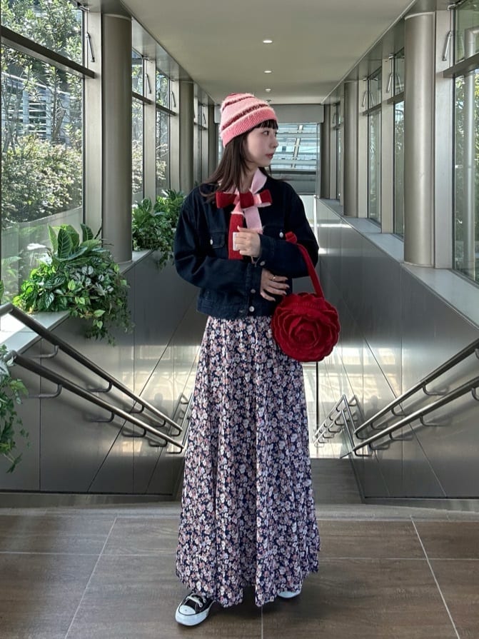ニット帽と細マフラーのセットが主役の、フェミニンなカジュアルコーデ。細マフラーは今年のトレンドですが、着こなしが難しいという人はニット帽とのセットアイテムを取り入れるのもひとつの手。花柄とバラ型バッグの色にも統一感がある、完成度の高いスタイリングです。