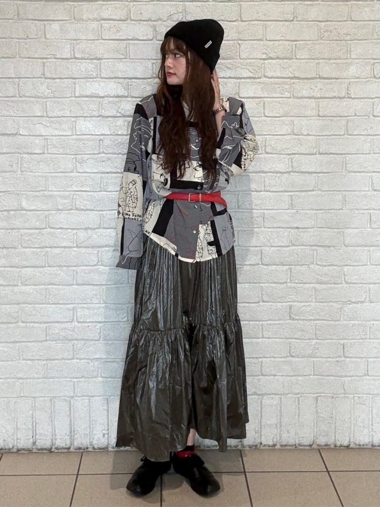 全体的に上品なシルエットながら、柄×素材感で個性を出したスタリング。プリントシャツと光沢感のあるティアードスカートを、色合わせで洗練させています。モードなハズしとして利いているのが、ニット帽と赤い小物たち。異素材の組み合わせを、より楽しげにまとめています。