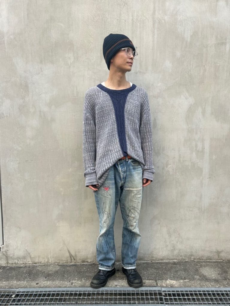 ざっくりとしたニットと、穿き込まれた雰囲気のデニムで、グランジなムードを演出。そこに上質なニット帽とメガネを合わせて、韓国スターのような上品なスタイリングに。ニットアイテムをブルー系でまとめているのも、おしゃれに見せるポイントです。
