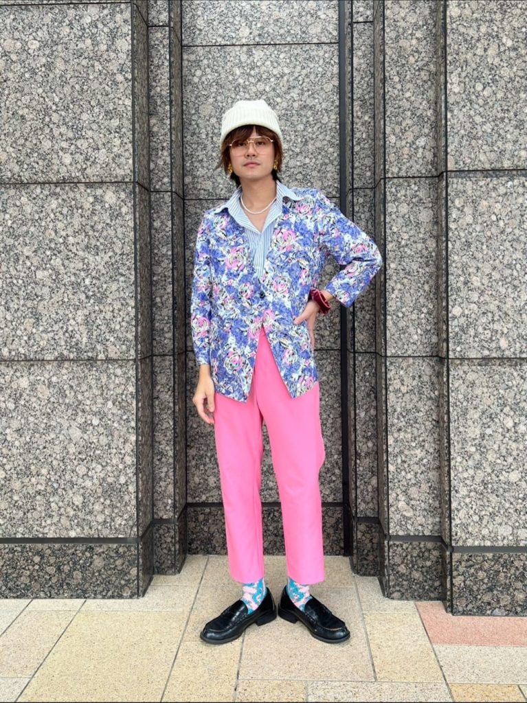 花柄ジャケットにビビットなピンクパンツを合わせた大胆な上級者コーデ。攻めたコーディネートに抜け感をプラスしているのが、白のニット帽。強めの色を和らげながら、カジュアルダウンする効果も。きれいめにキメすぎたくないときにニット帽を合わせるテクニックは、ぜひ真似してみて。