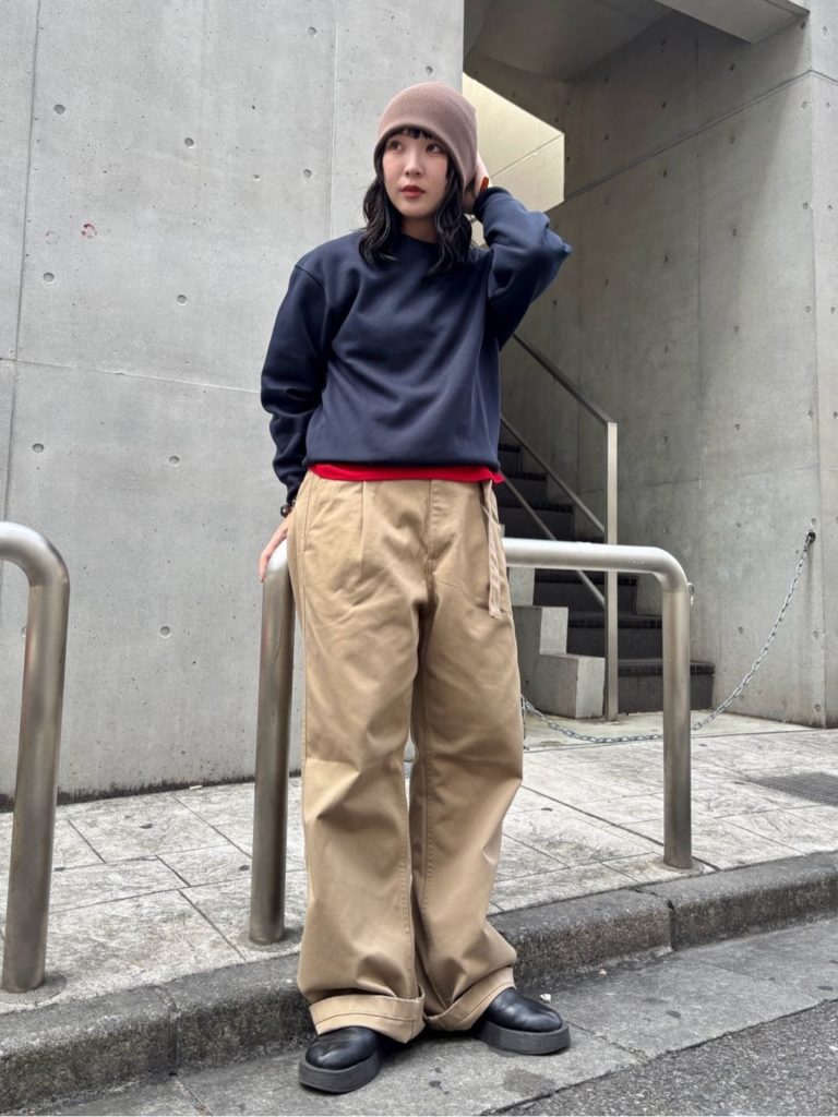 スウェットにチノパン、ブーツを合わせたメンズライクなアメカジコーデ。無骨なイメージを活かすなら、ビーニーを目深に被ってかっこよく決めて。全体的に落ち着いたカラーでまとめていますが、インナーの赤Tをチラ見せすることで地味にならずにこなれ感をプラス。