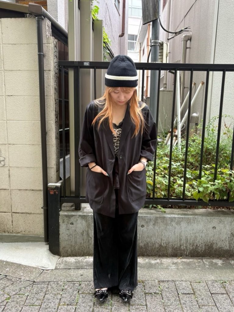 オーバーサイズなジャケットと、光沢感のあるワイドパンツでつくるゆるいシルエットが、今の気分にぴったりな大人のコーディネート。インナーのレオパード柄を上手くなじませているのが、白いラインが印象的なニット帽です。ラフさとエレガントが両立した、程よく肩の力の抜けたスタイリングです。