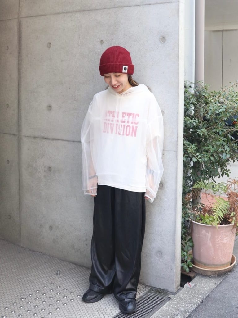 シアー素材のパーカーに光沢感のあるワイドパンツを合わせた、旬のスタイリング。ニット帽と中に入れたカットソーのロゴを赤でリンクさせることで、統一感のある洗練された印象に仕上がります。艶やかなパンツが大人っぽさを演出し、モードストリートの完成です。