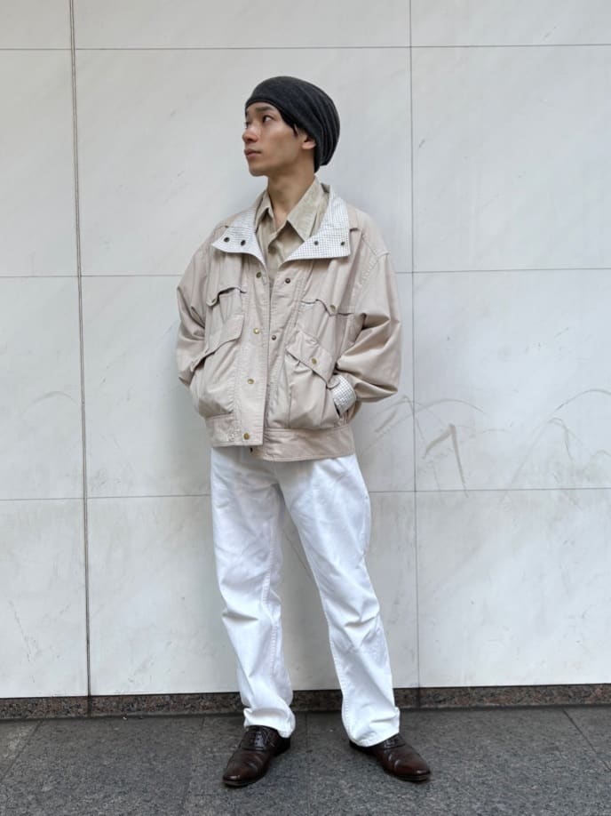 エクリュやベージュを基調とした、大人のワントーンコーデ。きれいめな印象のシャツを、ブルゾンでハズして。白系コーデは全体がぼやけがちなところを、ニット帽とシューズをダークトーンにすることで、全体が引き締まっています。