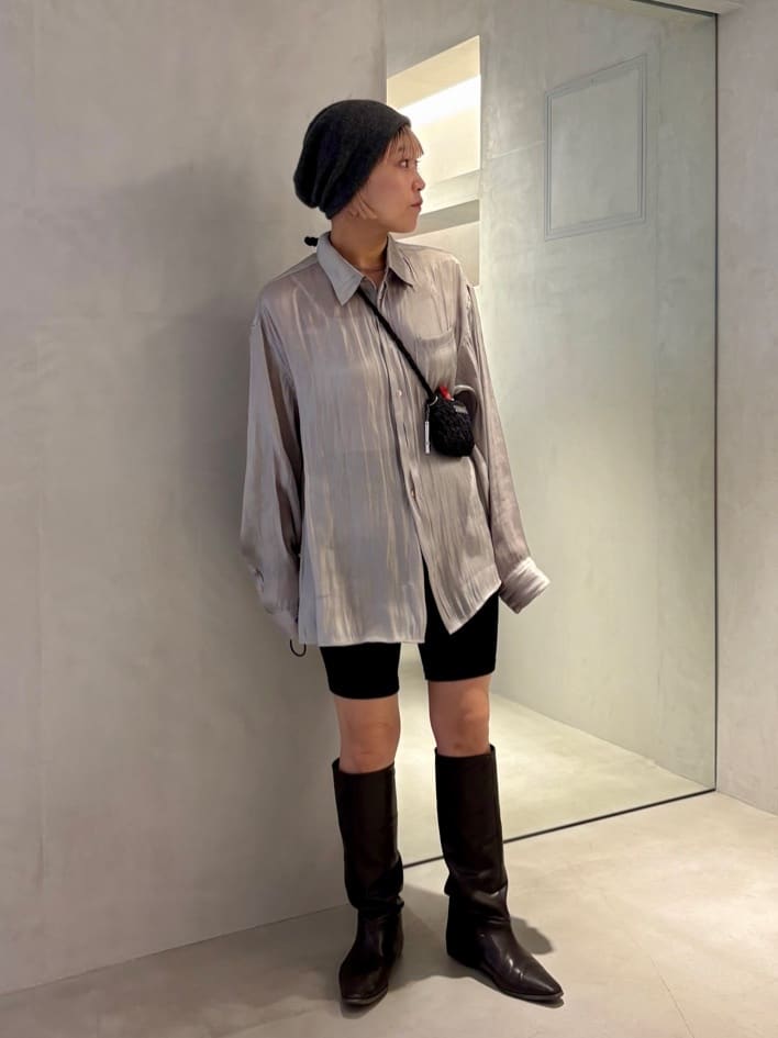 光沢のあるサイズシャツにショートパンツとロングブーツを合わせた、エッジの利いた着こなし。モード感を程よくカジュアルダウンしているのが、ゆったりシルエットのビーニー。ニット帽の柔らかさが大人の余裕を感じさせる、ミニマルなスタイルです。