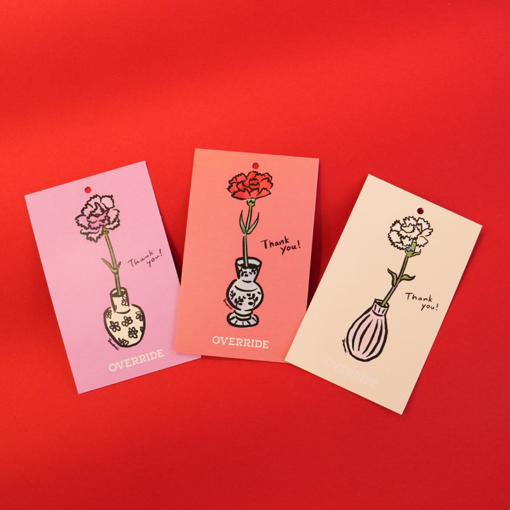また、オーバーライド店舗ではギフトラッピングにメッセージカードをお付けいただけます。今回は母の日限定で、一輪挿しのイラストが描かれた3種類のメッセージカードをご用意。ギフトバッグをご購入のお客様にプレゼントいたします。