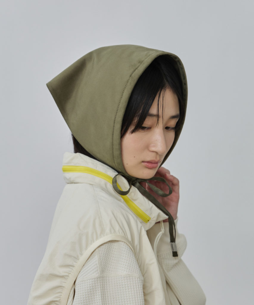 ハリのある生地が生み出す直線的なシルエットが、着用時に立体感を与えてくれるから、ただ巻くだけでもサマになるのが嬉しい。1枚はもちろん、キャップの上やハットの下にレイヤードするのも今の気分。あご紐を通した部分は、生地を寄せてサイズ調整ができるようになっているので、少し絞って付け襟風のアレンジも楽しめます。