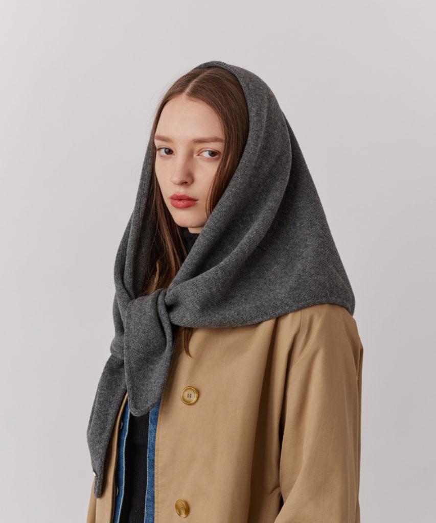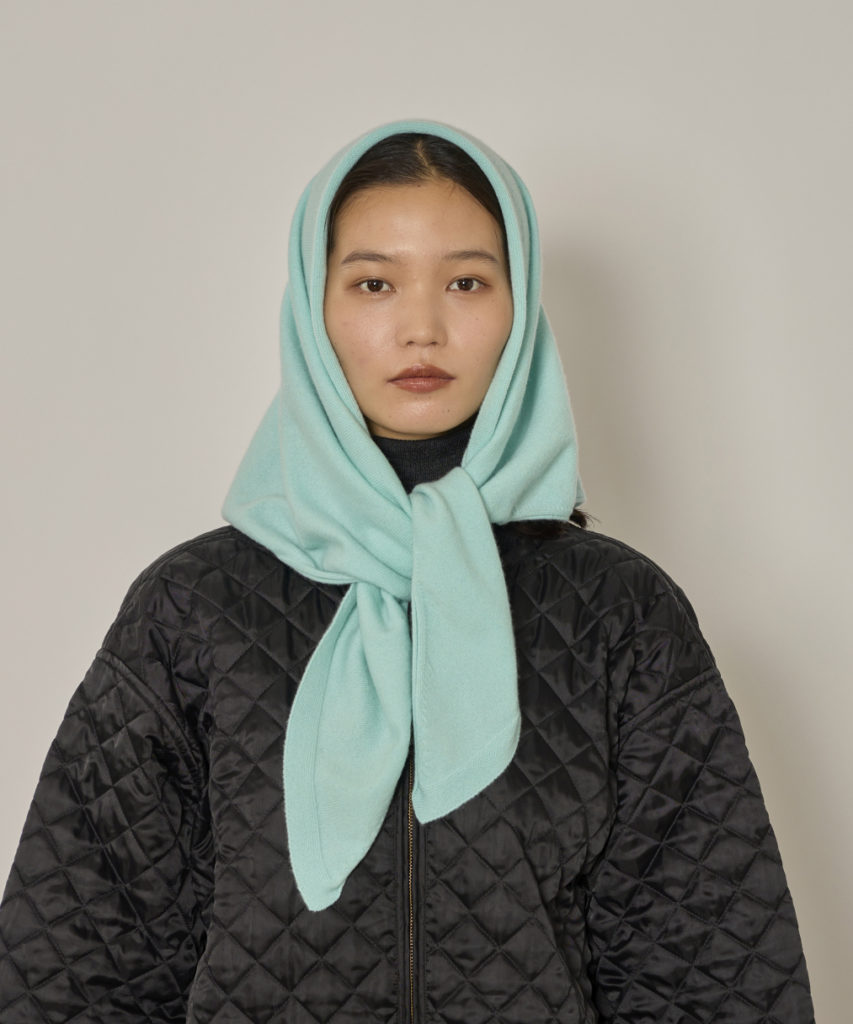 バブーシュカと同じ三角形ではあるものの、三角巾というよりはストールと呼ぶべきサイズのアイテム。カシミヤ100%の糸で、チクチクせずにやさしく頭から首元を包み込んでくれるのが嬉しいですね。おしゃれに、防寒に、長く活躍してくれそうな1枚です。