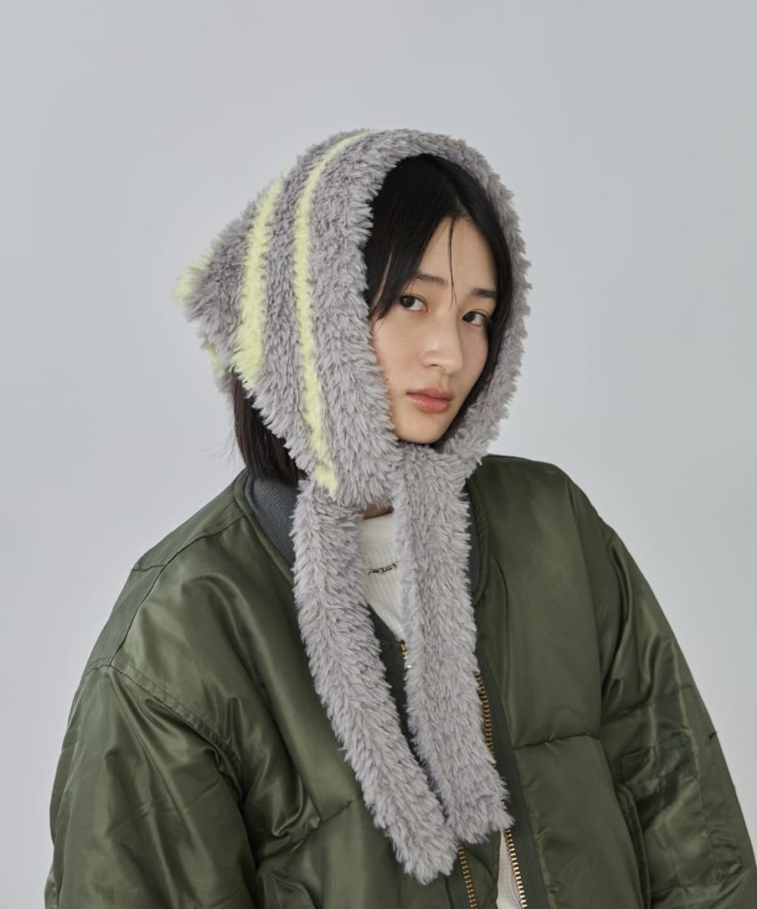バブーシュカを大きくしたようなこちらのスカーフは、フェイクファー糸を使用。ふんわり&もこもこで、ボリューム感のある仕上がりになっています。ボーダーのほかに無地の展開もあるので、好みや使いやすさで選んで。