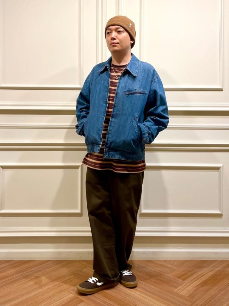 デニムジャケットとワイドパンツのアメカジスタイルに、キャメル色のニット帽を合わせた、都会的なワークカジュアルです。スタイリングの決め手は、全身に濃淡の異なるブラウン系を散りばめること。この色使いが、あたたかみがありつつ洗練されたムードを高めています。