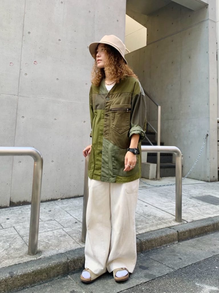 ミリタリーライクなジャケットに、ベージュ系アイテムを合わせて洗練度をアップ。ハットとボトムス、シューズをニュアンスカラーでまとめて、コントラストで抜け感を生み出しているのがポイントです。リラックスした雰囲気を保ちつつ、統一感のある大人の余裕を感じるスタイルです。