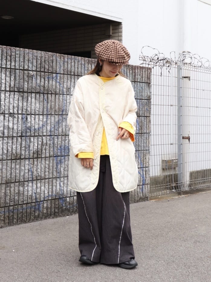 アイボリーのキルティングコートに、ブラウン系の細かなチェック柄キャスケットを合わせた、素材感と色使いのコントラストが利いたスタイル。インナーの黄色もブラウンと相性がよく、それでいて差し色として利いています。リラックスシルエットにクラシカルなチェック柄のキャスケットが加わったことで、コーデに品格が漂います。