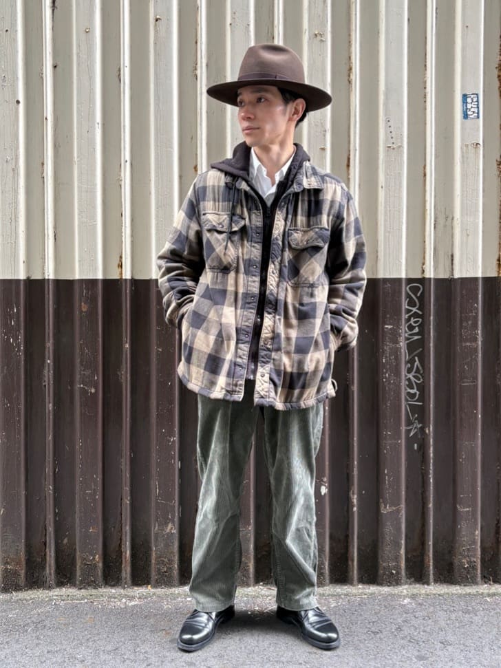 アメカジライクなアイテムに、つば広ハットを合わせたスタイル。ハットの深みのあるブラウンが全体のヴィンテージライクな色合いを格上げし、一気にトラッドで知的なムードを演出しています。足元と顔まわりを引き締めることで、カジュアルコーデの洗練度がアップ。