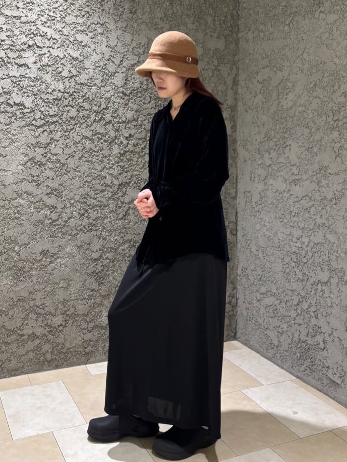オールブラックのシックな着こなしに、キャメルブラウンのクラシカルなクロッシェハットを合わせた洗練スタイリング。ベロア素材のトップスや、落ち感のあるロングスカートが持つ重厚なムードを、ハットが持つ柔らかな質感と暖かみのある色が引き立てています。
