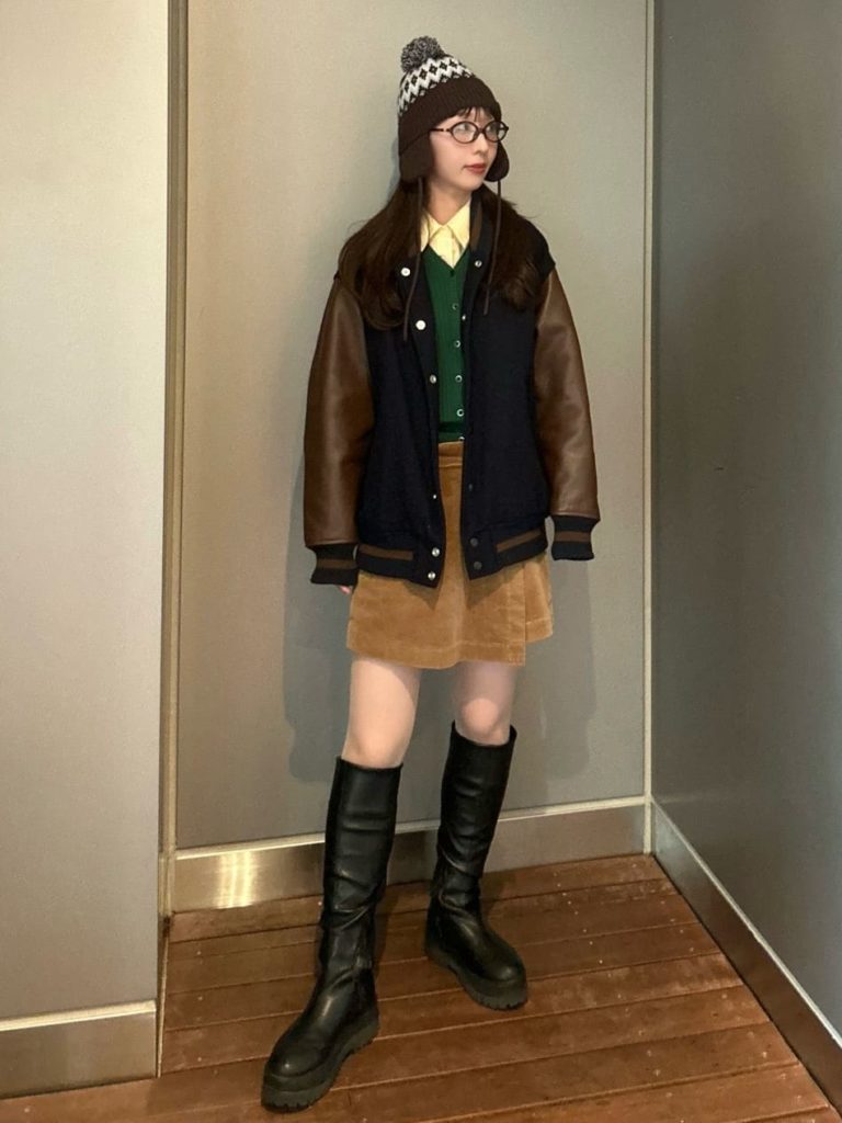 プレッピーやトラッド要素満載の着こなしに、ノルディック柄のニット帽を合わせた今年らしいコーディネート。全体をブラウンで統一感を保ちながら、差し色や柄で遊び心をプラス。ポンポンや耳当ての付いた柄ニット帽が、優等生になりすぎない抜け感を生んでいます。
