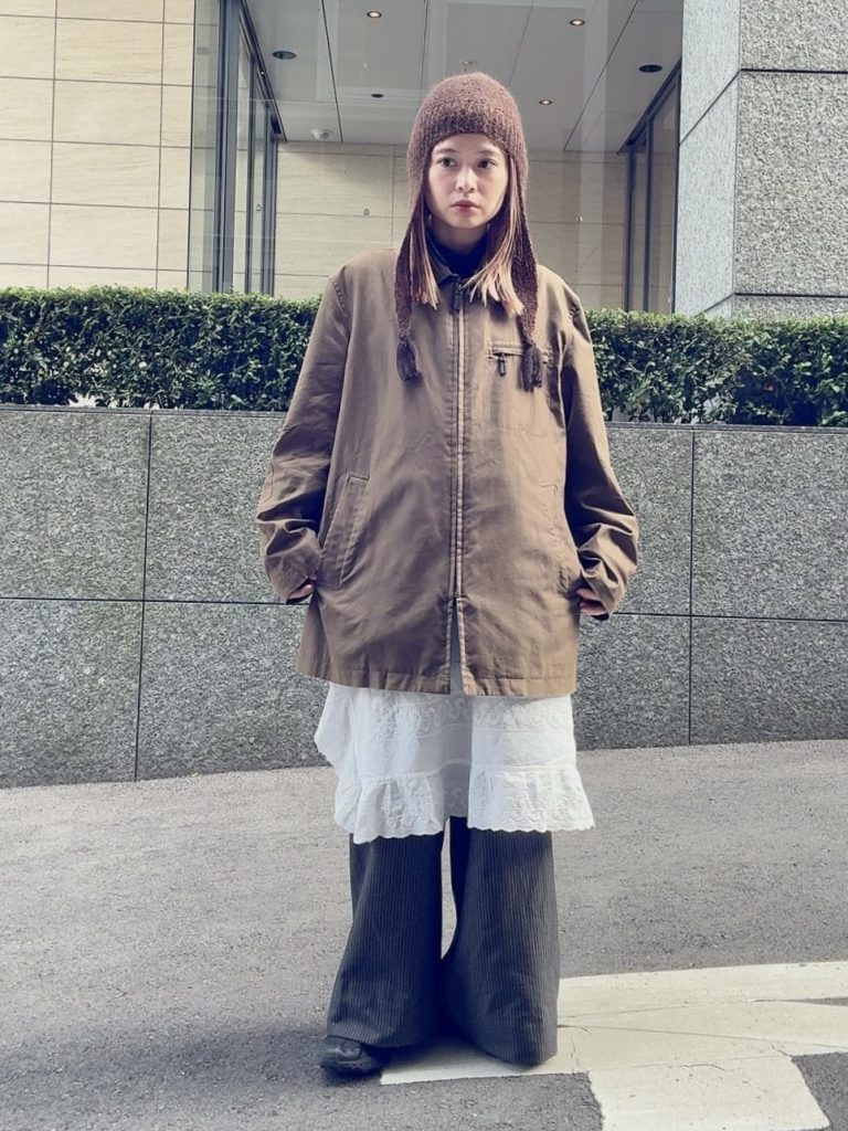 オーバーサイズのワークジャケットに耳当て付きニット帽を合わせた、リラックス感のある着こなし。ボリューミーなアウターと重厚なワイドパンツに対し、ふんわりとしたニット帽とレーススカートで、絶妙な甘さと軽やかさをプラス。ニット帽とジャケットのブラウンがワントーンで繋がり、洗練されたミックスコーデに。
