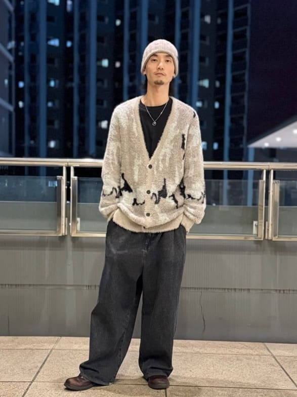オーバーサイズの柄カーディガンとワイドデニムにベージュのニット帽を合わせた、エフォートレスなカジュアルスタイル。カーディガンと帽子を明るいブラウン系ワントーンが力の抜けた柔らかい印象を与えつつ、インナーとボトムスのダークトーンで全体を引き締めています。
