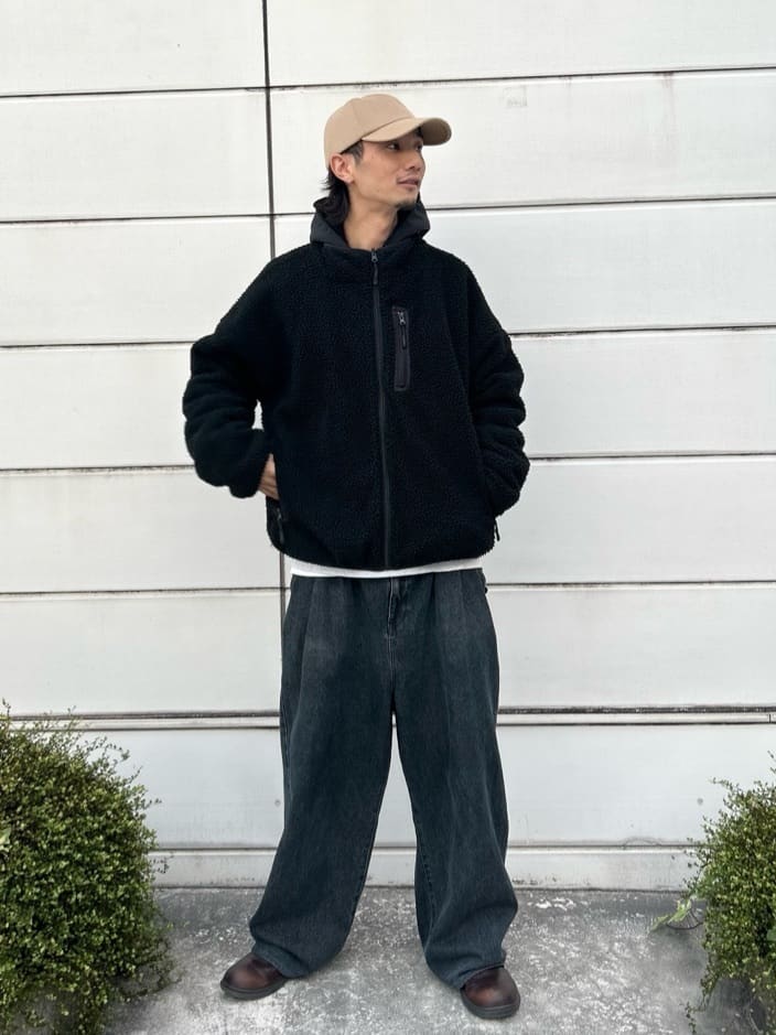 黒のボアジャケットとルーズなデニムの重厚なカジュアルスタイルを、ベージュのキャップで軽やかさをプラス。トレンドのリラックスシルエットを野暮ったく見せないためには、小物で色や質感をコントロールするのがポイントです。キャップは深めに被ってクールな仕上がりに。