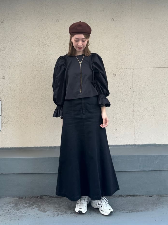 パフスリーブトップスとフレアスカートのオールブラックコーデに、シックなダークブラウンのベレー帽を合わせた大人の甘辛ミックススタイル。ベレー帽の暖かみのあるブラウンが黒の重さを和らげ、顔まわりに柔らかなアクセントを加えています。帽子をシックなベレー帽にすれば、スニーカー合わせでも品のある着こなしに。