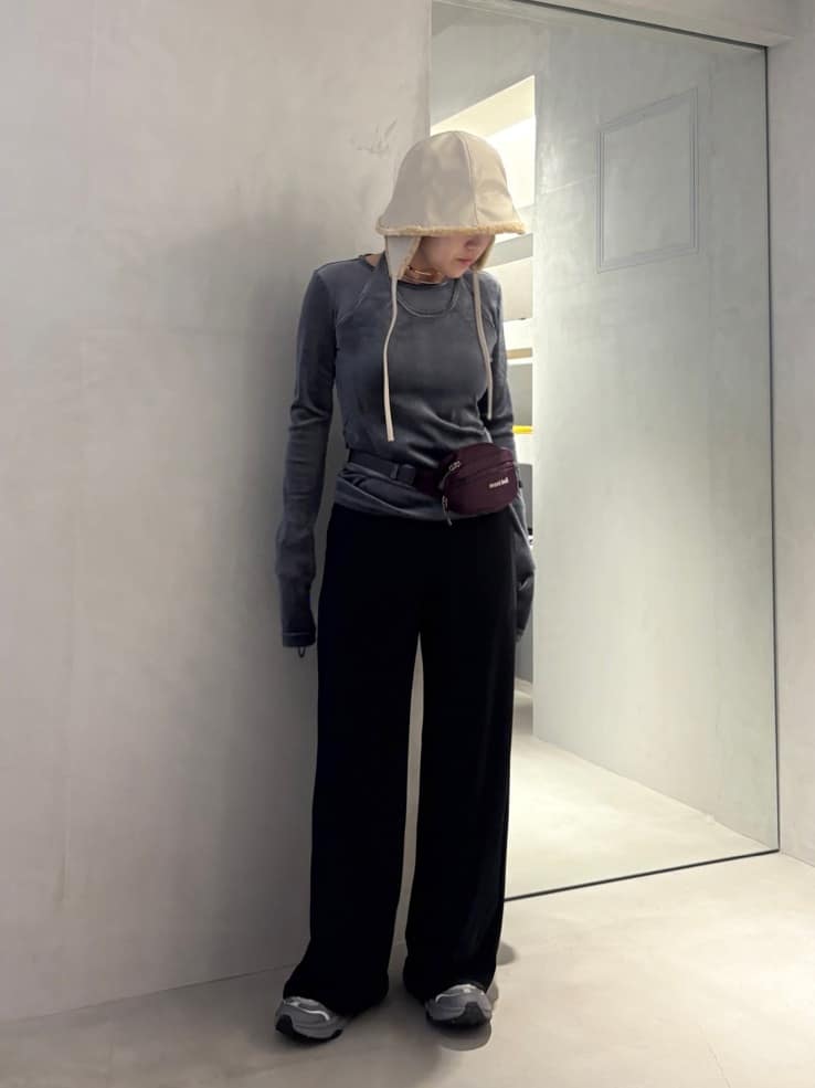 トップスとボトムスをダークトーンでまとめたミニマルなIラインスタイル。ムートン調の耳当て付きチューリップハットで立体感と温かみをプラスし、重心を上にあげています。あご紐を垂らすことで縦長のラインを強調しつつ、スタイリングに軽快な抜け感をもたらす効果も。