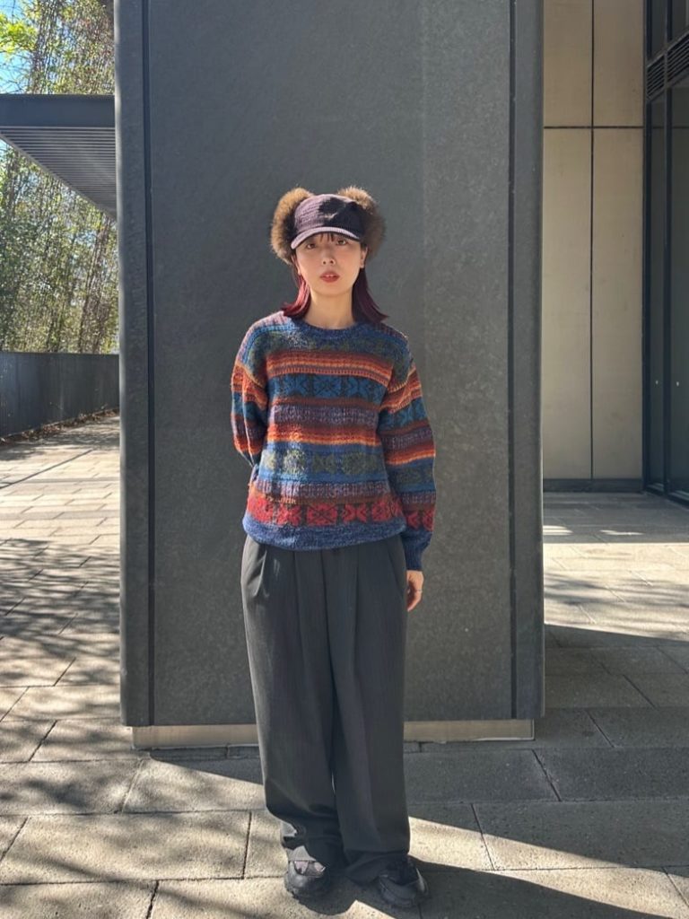 大胆な柄のレトロなニットに、耳当て部分にファーがあしらわれたキャップを合わせた遊び心のあるスタイル。ニットが持つ多色使いやヴィンテージ感を、落ち着いたダークカラーのパンツとキャップがうまく引き立てています。落ち着いたカラーのキャップのおかげで全体が引き締まり、柄アイテムも大人っぽく着こなせそう。