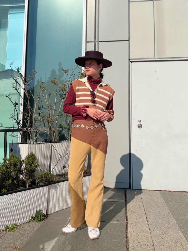 ハットからタートルネック・ベスト・パンツと、トーンの異なるブラウン系カラーを巧みに重ねた、美しいグラデーションコーデ。個性的なアイテムのレイヤードも、ブラウンでまとめることで統一感のある印象に。帽子の濃色から始まり、下に向かって明るい色にすることで、スタイルアップ効果も。