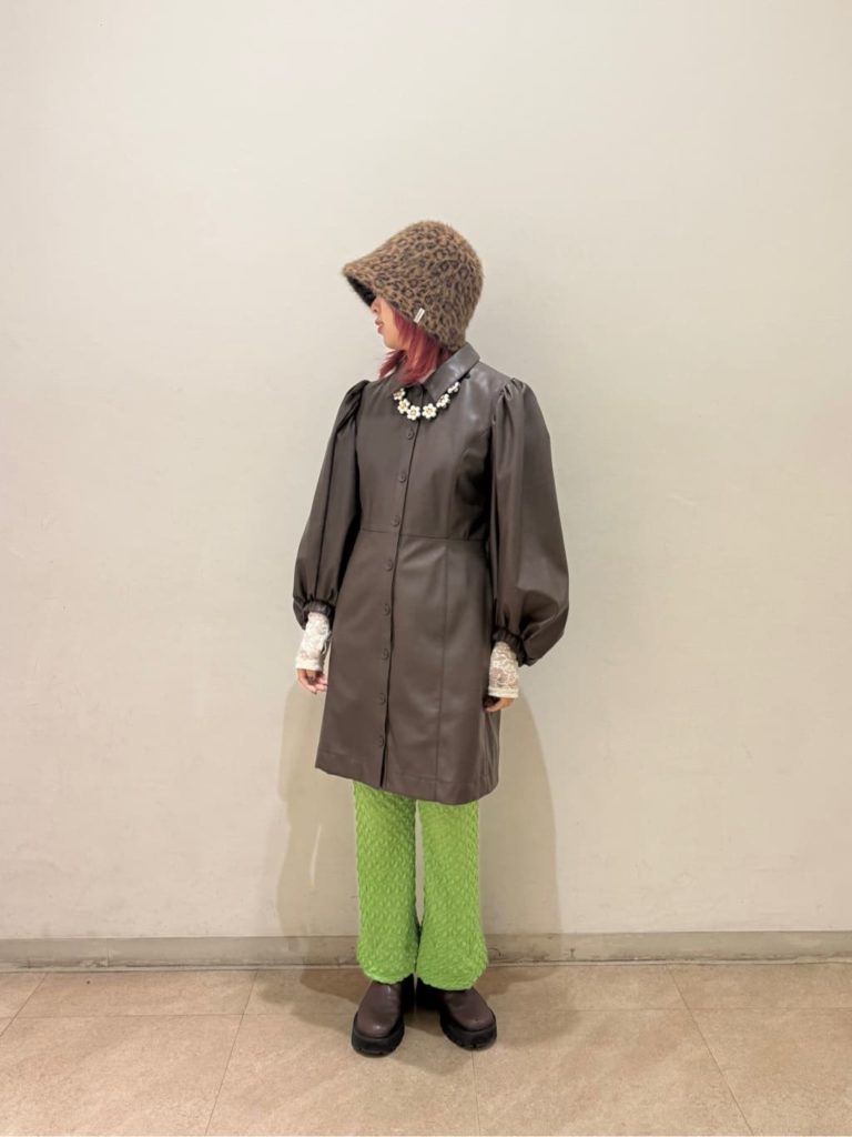 レザー調のワンピースに華やかなライトグリーンのパンツを合わせた、エッジィなコーディネート。その完成度を高めるのが、帽子をはじめとした小物使い。レオパード柄を使いつつも、全体がブラウン系カラーでリンクすることで上品な印象に。甘めなアイテムと辛口な素材や柄のミックスが、今年らしい個性を演出しています。