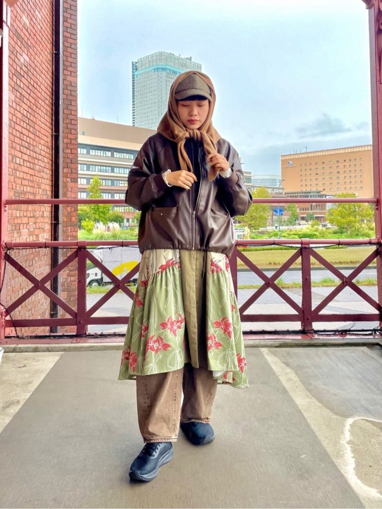 バブーシュカなどのスカーフをキャップに重ねるスタイルは、今年のトレンドのひとつ。さらにレザーブルゾン・柄スカート・ワイドパンツという難易度の高そうなミックスコーデが成立しているのは、全体の色調をアーストーンでまとめているから。多彩な素材が集まる今年の冬こそ挑戦してみて。