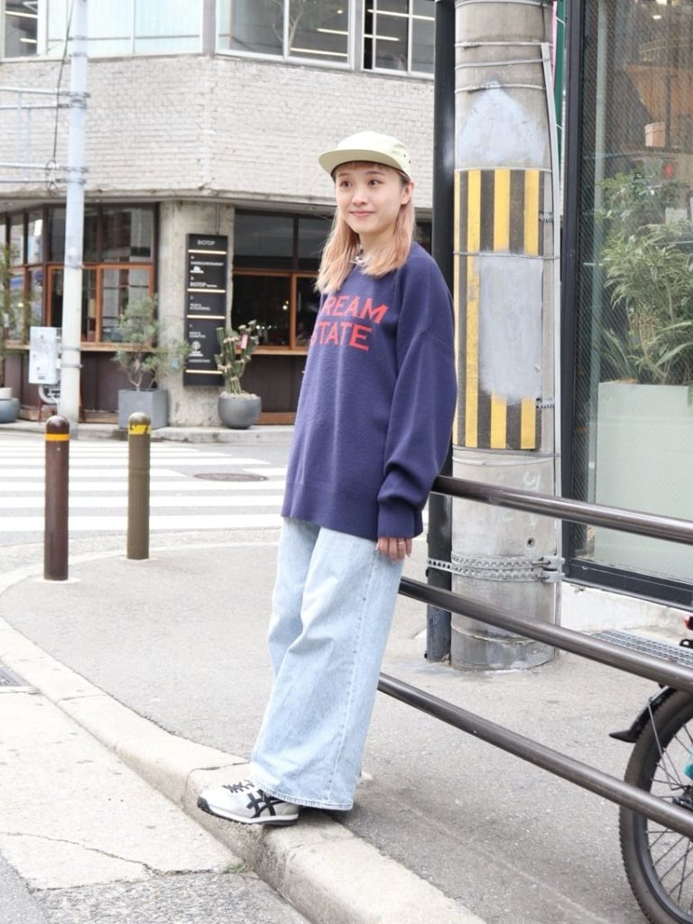 ロゴが映えるネイビーのオーバーサイズスウェットに、明るいベージュのキャップを合わせた、ポップでカジュアルなスタイリング。ジェットキャップのシルエットが、ボーイッシュなこなれ感を演出しています。