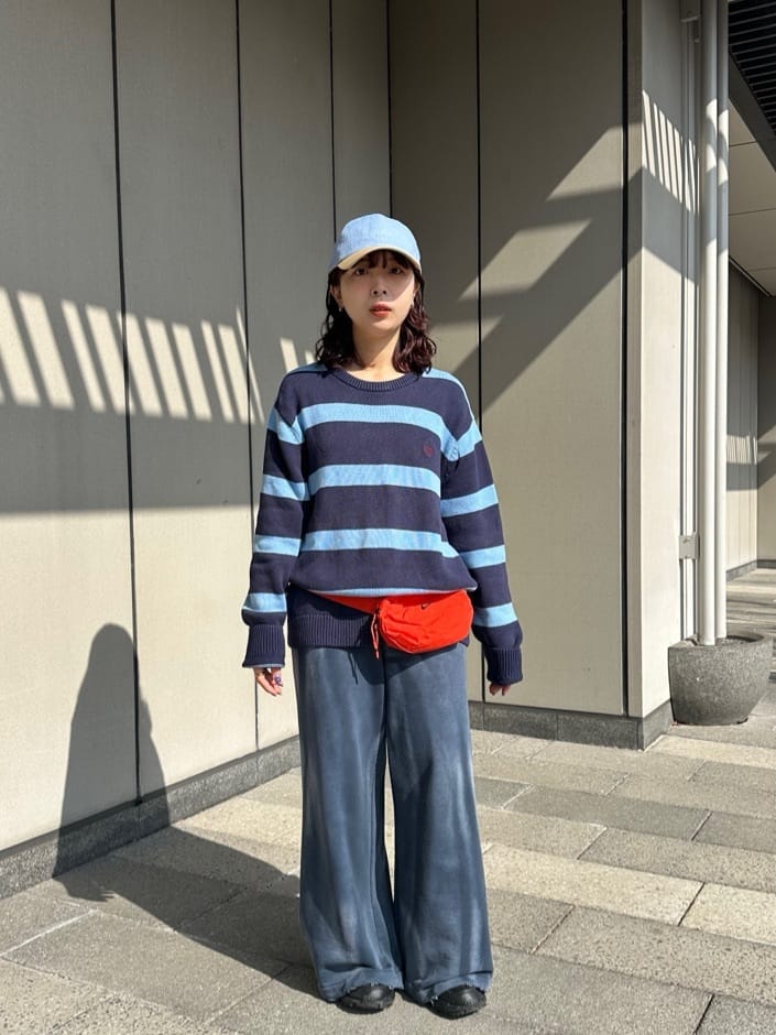 ネイビー×水色のボーダーニットに同系色のキャップを合わせた、春らしい爽やかコーデ。赤のウエストポーチが差し色として利いています。同系色でまとめながら小物で変化をつけるのは、初心者にも取り入れやすいテクニックです。