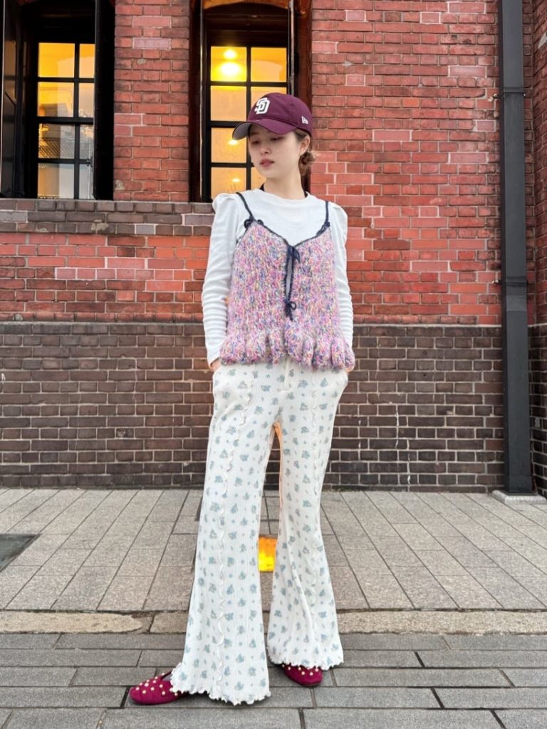 ガーリーなスタイリングにニューエラキャップを合わせた甘辛ミックス。フェミニンコーデをキャップでハズすことで、こなれた抜け感が生まれています。えんじとピンクの絶妙なトーン合わせが、上級者らしい着こなしのポイント。