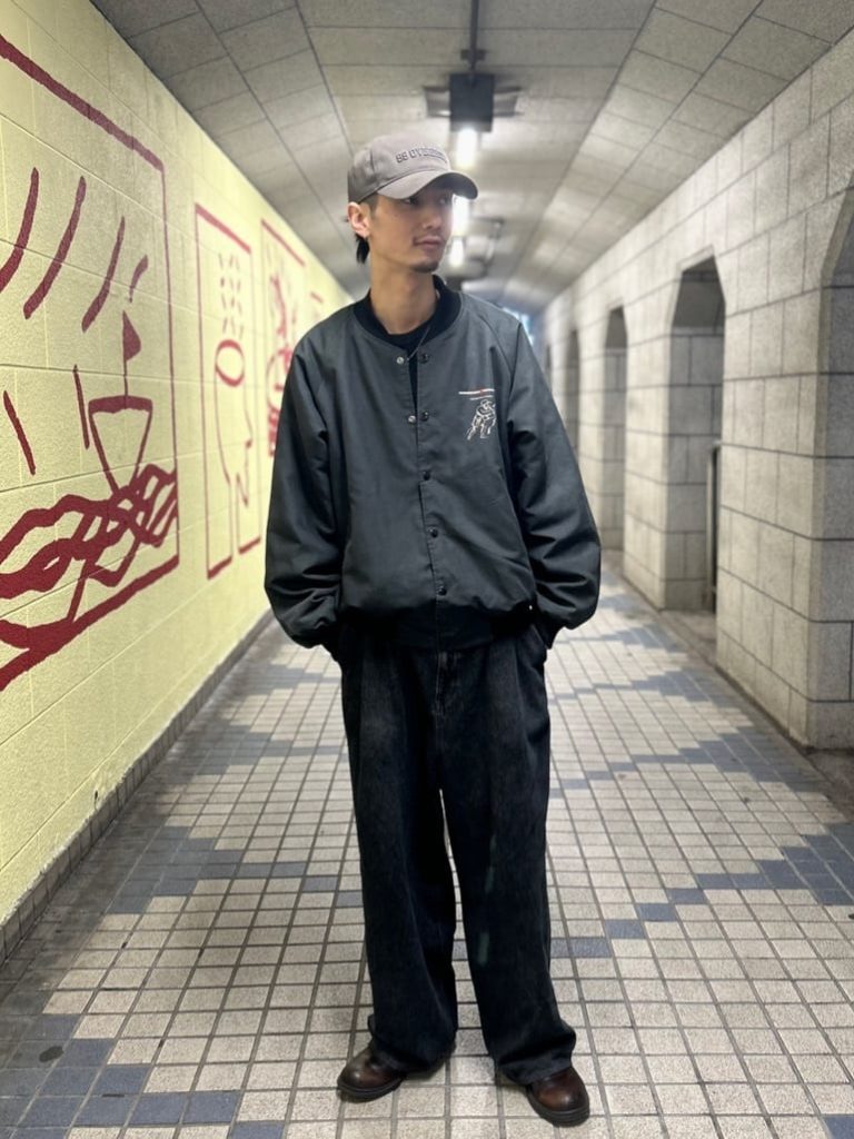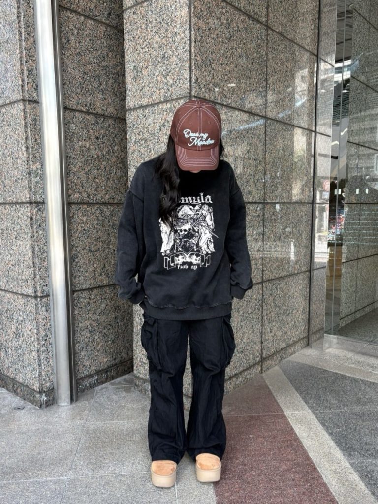 グラフィックスウェット×カーゴパンツのオールブラックスタイルに、ブラウンのロゴキャップをオン。全身黒でまとめたハードな印象のコーデを、ブラウンキャップとフロントのブルーロゴが絶妙に和らげ、甘辛MIXに仕上げています。