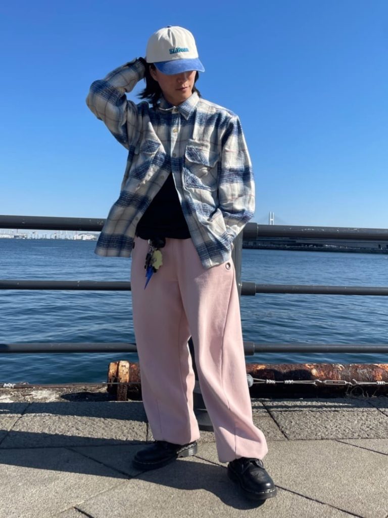 ネイビーのチェックシャツに合わせて、ブルーのキャップをチョイス。今季注目の2トーンキャップは、カジュアルコーデのこなれ感を高めてくれます。ボトムスのピンクとキャップの白が、コーデに軽やかさをプラス。