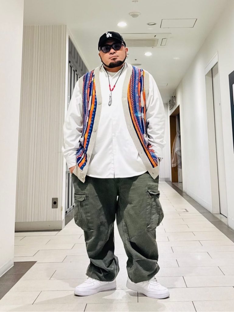 白T×カーゴパンツのベーシックカジュアルに、カラフルなエスニック柄ベストを重ねてインパクトを。個性的なベストを主役に、キャップはシンプルな黒を選ぶのが正解。差し色を足しすぎないことで、コーデにまとまりが生まれます。