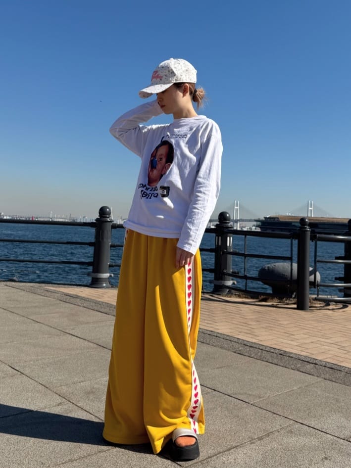 ハーフジップスウェットにプリーツスカート、ワイドパンツを重ねたスポーティとガーリーのMIXコーデ。ピンクのロゴキャップが、スポーティとガーリーをつなげる役割を果たしています。韓国ストリート感あふれる、2026年らしいスタイル。