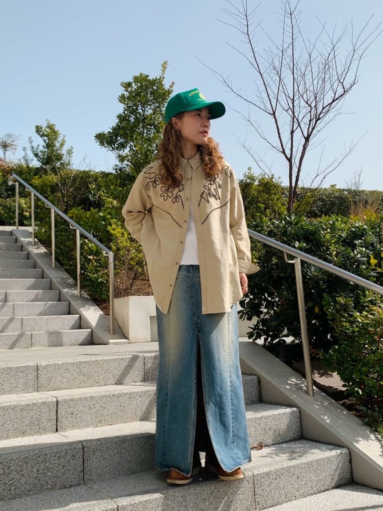 刺繍入りのベージュウエスタンシャツに、グリーンのロゴキャップを合わせたコーデ。ナチュラルに収まりがちな組み合わせですが、キャップで鮮やかなカラーをプラスすることでこなれ感がアップ。大人カジュアルにおすすめの色使いです。