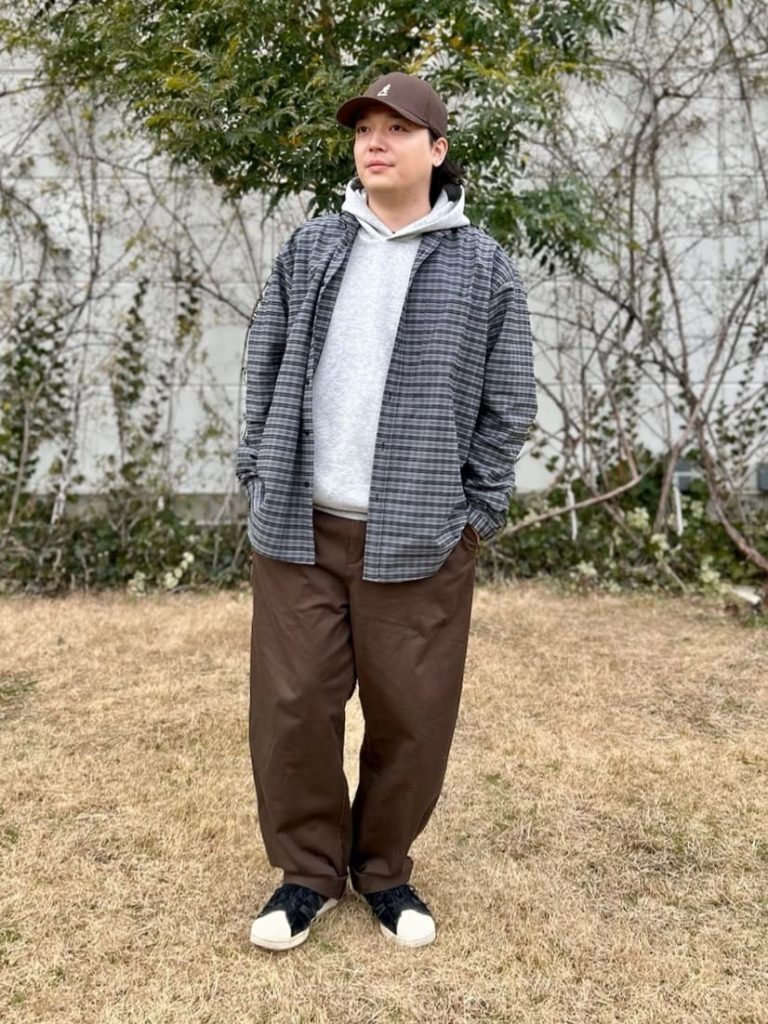 パーカーにチェックシャツを羽織った、肩の力の抜けたカジュアルコーデ。キャップとボトムスをブラウン系で統一することで、まとまりが生まれて落ち着いた雰囲気に。30〜40代の休日コーデにもぴったりな、大人のスタイリングです。