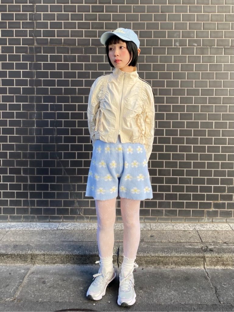 花柄のショーツにラッフルジャケットを合わせた、スポーティなガーリーコーデ。キャップは淡いブルーとベージュのロゴで、コーデと見事にリンク。レースタイツとスニーカーで全体を軽やかにまとめた、今年の春夏らしいMIXコーデです。