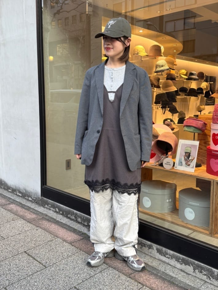 テーラードジャケット×レースヘムワンピースのきれいめな組み合わせを、インナーやボトムス、シューズでカジュアルにハズしたスタイル。カーキのキャップはカジュアルながらも落ち着いた雰囲気で、テイストMIXにもってこいのアイテムです。