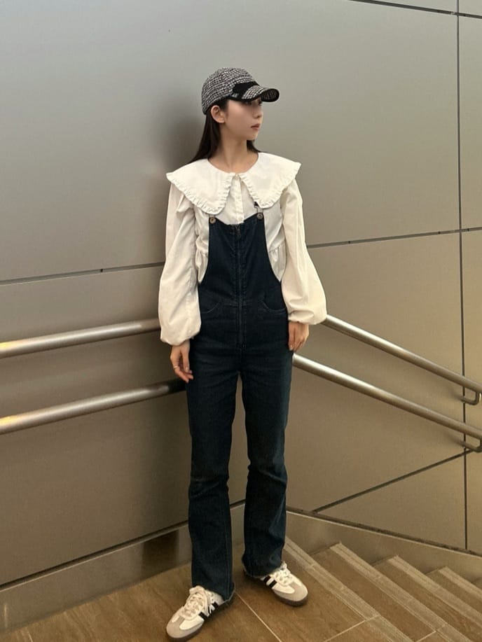 ガーリーなフリルブラウスにサロペットを合わせた甘辛MIXコーデ。ツイード素材の黒キャップでどちらの要素も拾い、絶妙なバランスが生まれています。キャップの素材感にこだわることで、上品な印象をキープ。
