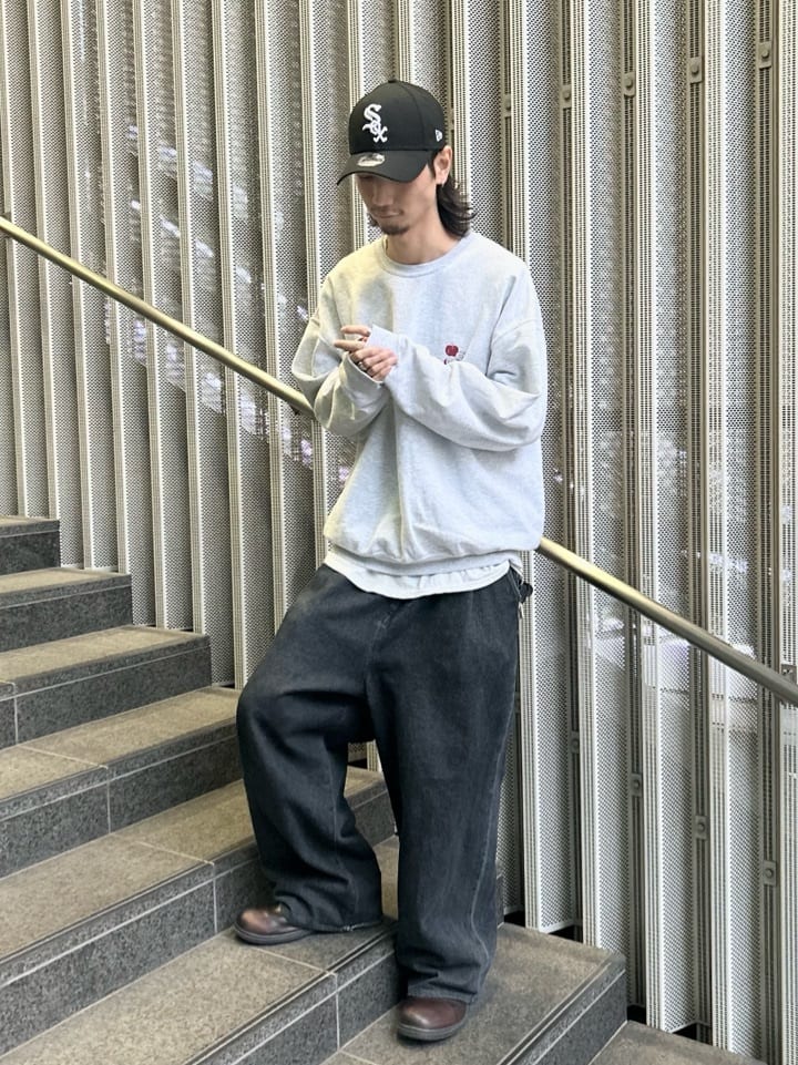 ニューエラキャップに、ヴィンテージライクなスウェット×ワイドデニムを合わせたシンプルなストリートコーデ。余計なものを足さない潔いスタイリングが、キャップのロゴを引き立てています。ブーツを合わせることで無骨な大人の雰囲気に。